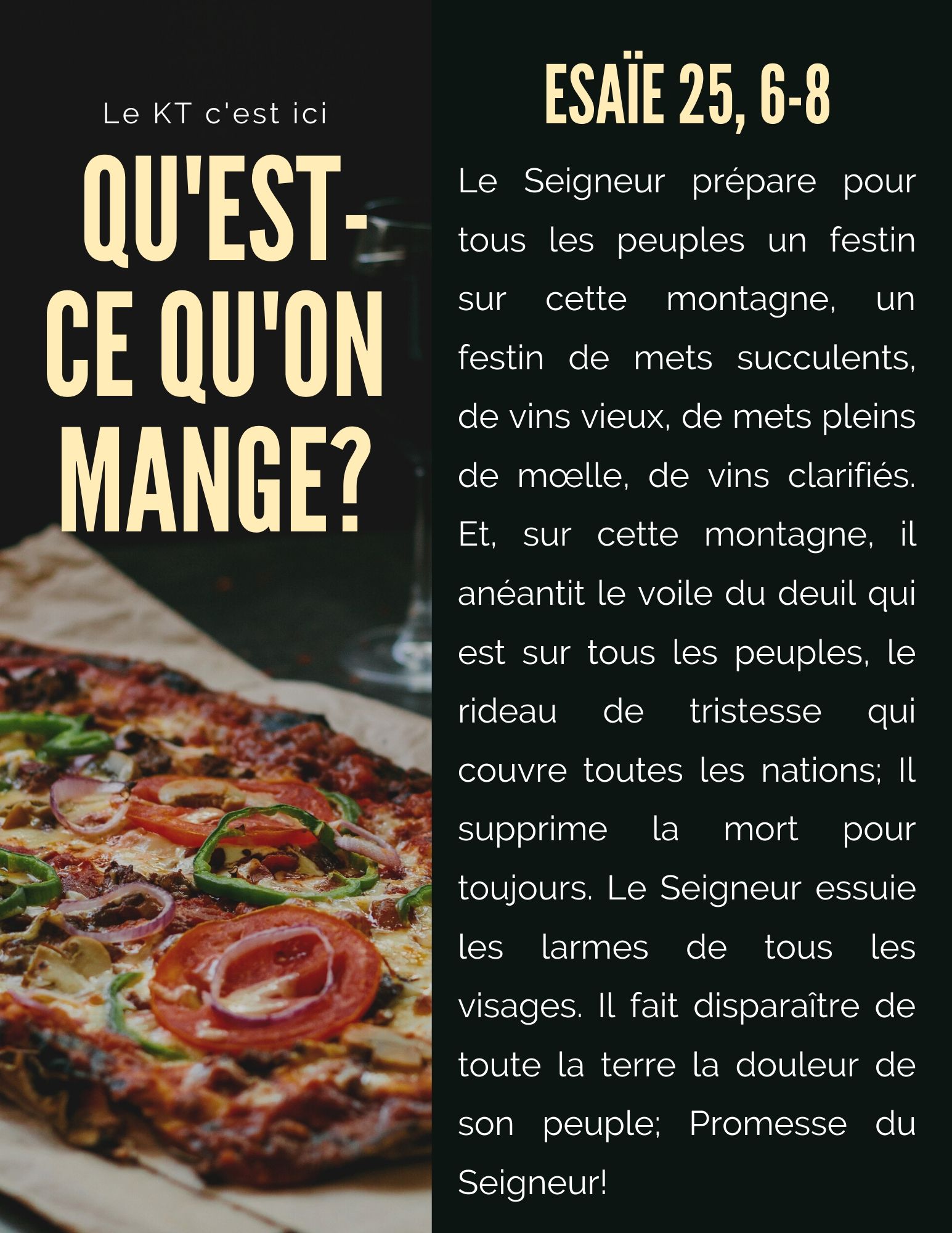 Durant la semaine du 27 avril au 1er mai, les catéchumènes du Joran et de la BARC ont réfléchi sur le thème: Qu’est-ce qu’on mange? Le confinement oblige, les tablées sont réduites et déjà on se réjouit des fêtes conviviales de l’après. Fait amusant, la Bible regorge de festin et autres repas en tous genres. Finalement, ce n’est pas si étonnant car, aujourd’hui comme jadis, manger ensemble soude et fortifie l’humanité.